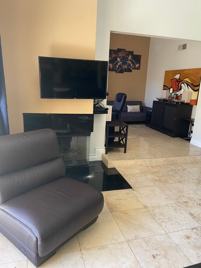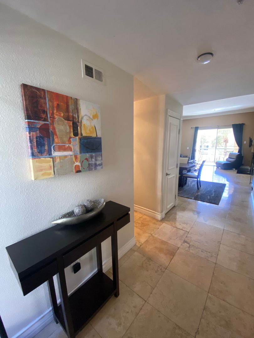 This gorgeous, fully furnished Penthouse at The Meridian Private Residences features 16' Vaulted ceilings, Gas Fireplace, Wet bar, Den with fold out sofa bed/futon, desk & work area, Sub Zero Fridge, Wolf Gas Stove, Granite countertops, Hardwood & travertine through out. Contemporary furnishings with TV’s in living room and both bedrooms. The Meridian Private Residences is a guard gated community that features 2 pools & spas, tennis courts, fitness center, saunas and so much more. Located only one block from the strip! List price is for a one year lease, utilities excluded. Also available for short term rental with gas and electric included with $150 cap per month. Cable/Internet included at no additional charge. Please call for details.